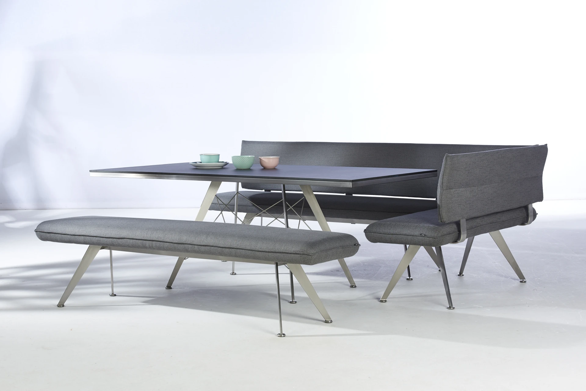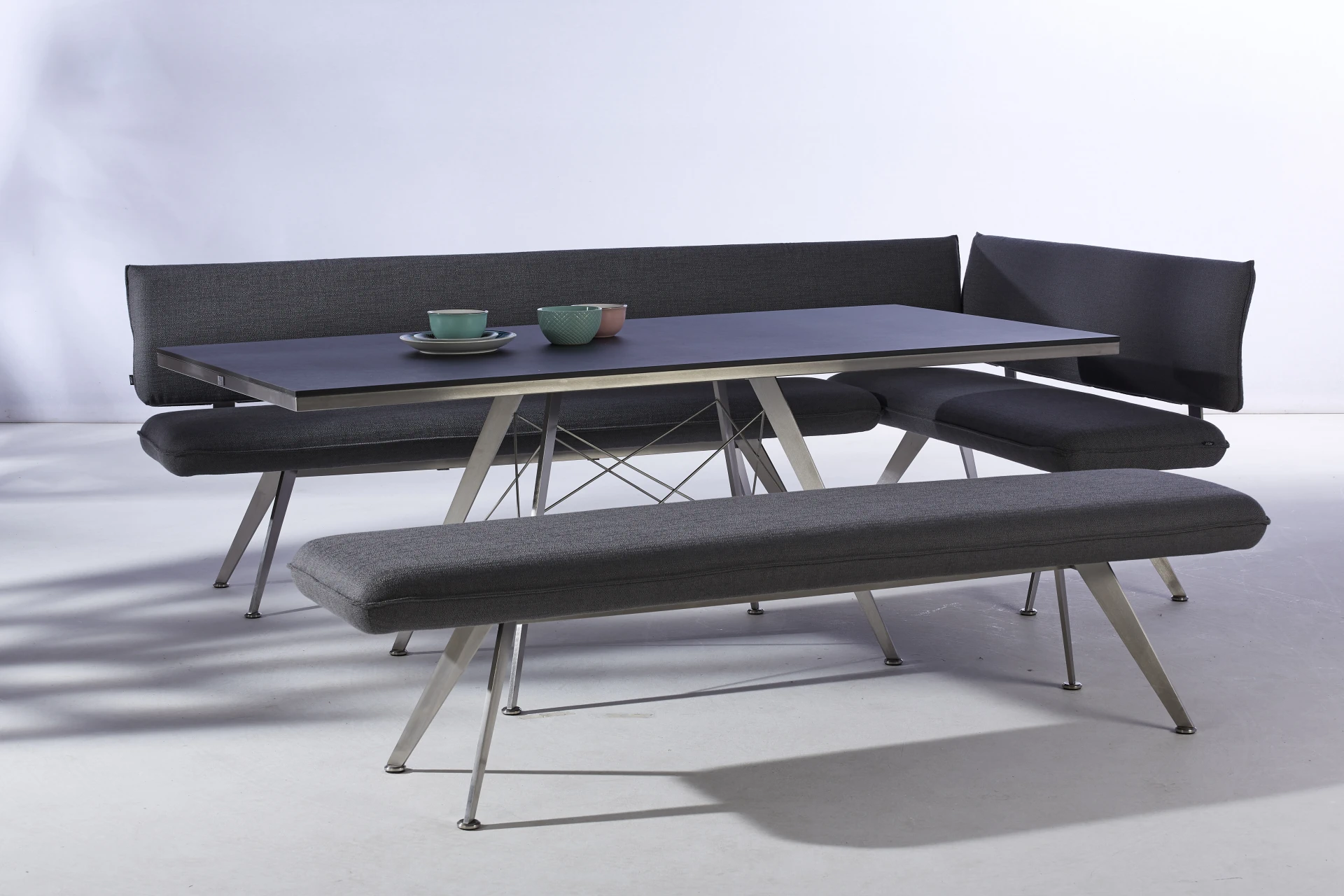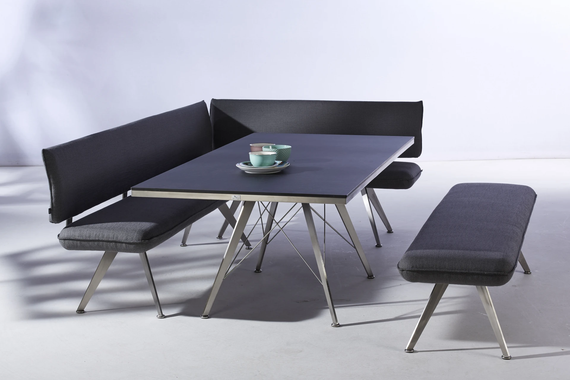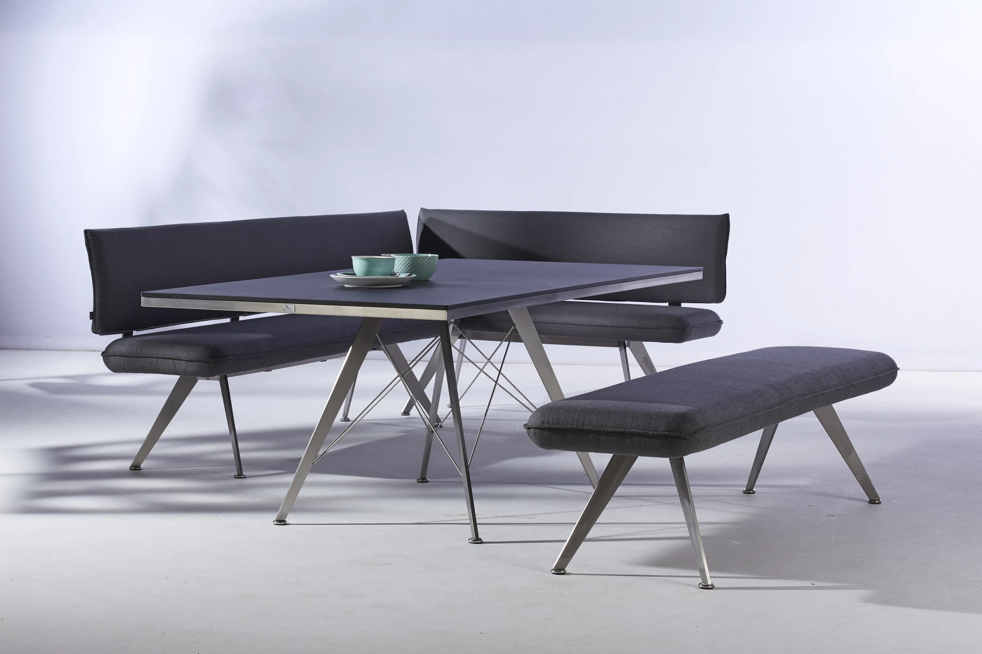 Hier verkaufte Konfiguration: Sitzbank mit Rückenlehne 150 cm, Edelstahlgestell mit dem Stoff Marengo (siehe unten). Abweichende Planungen auf Anfrage möglich – Wir beraten Sie gerne.