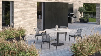 Das Highlight des Royal Botania Gartentisch EXES mit runder Tischplatte ist ein Dreifuss-Gestell, bei der sich die Beine an einem Punkt auf halber Strecke zwischen Boden und Tischplatte kreuzen. Ebenso hochwertig und optisch ansprechend ist das alternative Gestell mit vier Beinen für die elliptischen und ovalen Tischplatten.