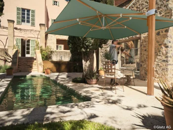 SUNWING CASA ist der Evergreen unter den Freiarmschirmen von Glatz. Das Dach lässt sich sowohl mit einer selbstarretierenden Kurbel bedienen und bis zu 45° Grad beidseitig schräg stellen als auch 360° Grad um den Mast drehen. Swiss Design.